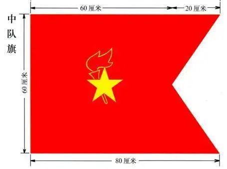 大队旗长120厘米、高90厘米。旗中心是五角星和火炬,五角星为黄色,火炬由黄色线条勾勒出轮廓。中队旗长80厘米、高60厘米。右端剪去高20厘米、底宽60厘米的等腰三角形,形成一个三角形缺口,五角星及火炬在以60厘米为边长的正方形中心