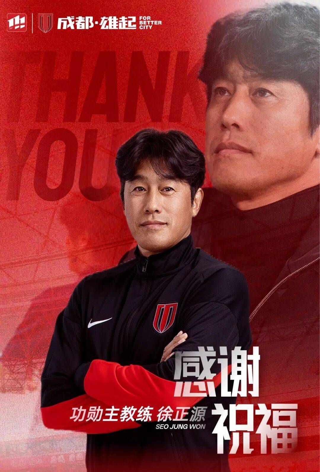 成都蓉城在官方公告中写道:“经友好协商,成都蓉城足球俱乐部与徐正源先生达成一致,决定不再续约,徐正源先生将不再担任成都蓉城足球俱乐部一线队主教练职务。在此,俱乐部全体成员谨向徐正源先生及其教练团队致以最诚挚的谢意。”